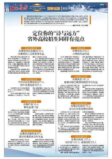 随着高考志愿填报季的临近,不少广东考生在“家门口”求学与填报外省院校之间陷入纠结。事实上,近年来省外高校在粤招生规模持续扩大,优质教育资源加速流动,为考生提供了更多元的选择空间。对于向往跨地域文化体验、瞄准特色专业优势、希望突破同质化竞争的考生而言,省外高校正成为值得重点关注的升学路径。本版特别梳理了多所热门省外院校2025年的招生新动态,涵盖顶尖学府的特色专业扩容、本硕博一站式人才培养计划以及新兴跨学科创新平台,助力考生精准定位适合自己的“诗与远方”。