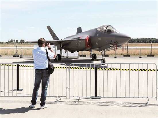 ■2022年6月22日,在德国首都柏林南郊,参观者拍摄展出的F-35A闪电II战斗机。