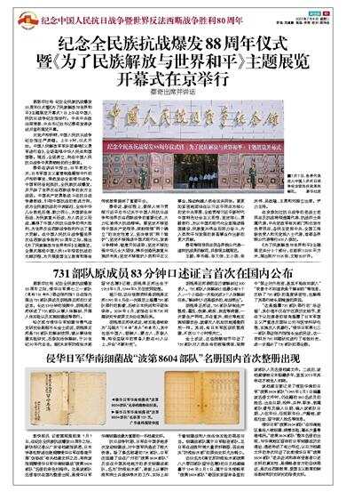 据新华社电 纪念全民族抗战爆发88周年仪式暨《为了民族解放与世界和平》主题展览开幕式7日上午在中国人民抗日战争纪念馆举行。中共中央政治局常委、中央书记处书记蔡奇发表讲话并宣布展览开幕。