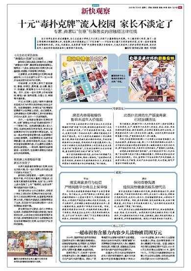 郑子殷指出,根据《中华人民共和国未成年人保护法》第五十五条要求,生产、销售用于未成年人的食品、药品、玩具、用具和游戏游艺设备、游乐设施等,应当符合国家或者行业标准,不得危害未成年人的人身安全和身心健康。这些扑克牌内容含有明显暴力内容,严重危害未成年人身心健康。