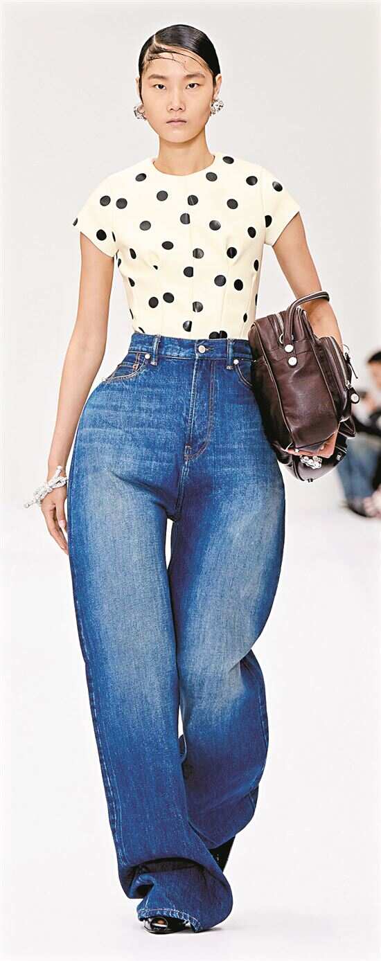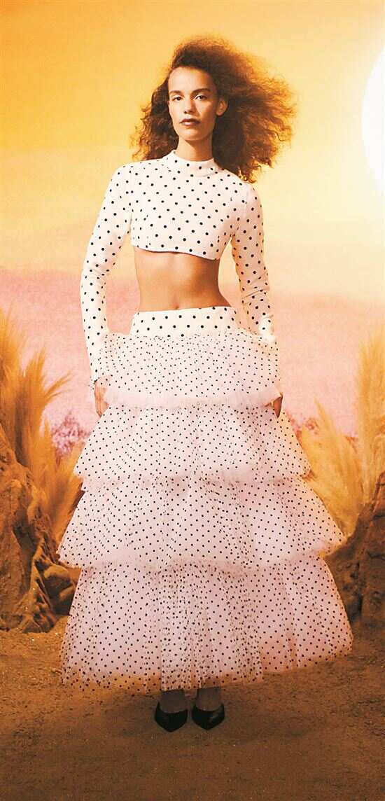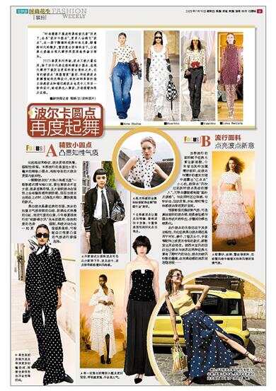 一颗颗波点如“大珠小珠落玉盘”一般散落衣摆与袖口间,要注意波点不宜太密,容易密集恐惧,且大面积波点在视觉上会有膨胀感和拥挤感,因而当波点出现在上衣时,记得选大领口、露肤度高的款式。