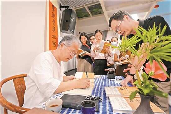 ▲7月10日,台湾作家、文化学者薛仁明携代表作《其人如天》新版亮相广州。图为薛仁明为新书签名。