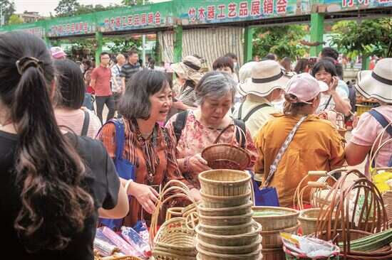 从常见的竹筐、竹筛、竹篮、竹椅,到精美的竹灯罩、工艺品、藤条编制的手提包……走进博览馆外的竹器手作街,琳琅满目的竹艺品,丰富了游客的购物体验,让游客们在欣赏乡村美景、领略非遗魅力的同时,把兼具观赏性和实用性的精美“手信”带回家。