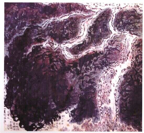 《筑成我们新的长城——八路军开赴长城抗战》主要表现八路军开赴长城作战,正在长城上向前行进,如抗战铁流滚滚浩荡。整个画面似铁壁铜墙的苍山如海,宛如长龙翻腾的数道长城横亘其中,体现“把我们的血肉,筑成我们新的长城”的民族正气。