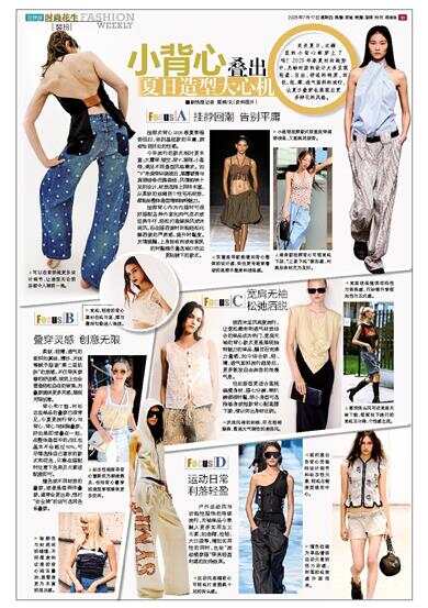 波西米亚风再度流行,让宽松廓形和透气材质结合的单品成为热门,宽肩无袖的背心款式更是展现独特魅力的单品,醒目而充满力量感,如今结合软、轻、薄、透气面料流行趋势后,更多散发自由奔放的浪漫气息。