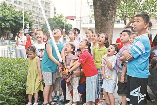 ■消防员在深圳市南山区西丽消防救援站进行备勤训练。小图为小朋友在深圳市福田区梅丰小型消防站开放日活动中体验多功能消防水枪。