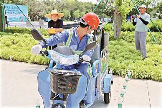 在全能环卫项目竞技中,驾驶电动保洁车的环卫工要求做到脚不沾地。