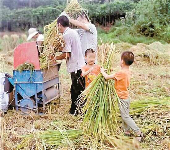 ▲农忙时,懂事的孩子会下地帮家人收稻谷。