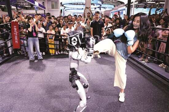 8月8日,宇树科技人形机器人在2025世界机器人大会上进行格斗表演。