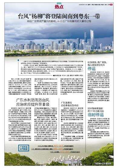 新快报讯 记者许力夫 通讯员张晓敏报道 为有效应对台风“杨柳”带来的恶劣天气,国铁广州局提前研判风险,计划对多条线路的运输秩序进行调整。自8月12日起,京广铁路、京九铁路部分列车停运;自8月13日起,杭深高铁、甬广高铁、梅汕高铁部分列车停运。受台风天气影响,部分正常运行的列车可能出现不同程度晚点。