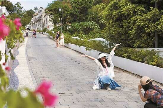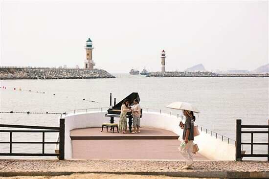 站在附近的爱民路大斜坡,斜坡上的绿树繁花、远处的灯塔、海上大风车都成为人们争先入镜的元素。一湾沙滩旁,人们还能坐在一架“钢琴”(景观模型)前,美美地拍出“海上钢琴师”的意境……
