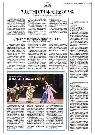 新快报讯 记者许婉婕 通讯员穗统宣报道 8月12日,国家统计局广州调查队发布的数据显示,7月,广州居民消费价格指数(CPI)环比上涨0.5%,同比持平;1-7月平均,广州CPI比上年同期下降0.2%。其中,食品价格环比下降0.8%(以下均指环比),非食品价格上涨0.8%;消费品价格与上月持平,服务价格上涨1.2%;八大类商品及服务价格呈6涨2降态势。