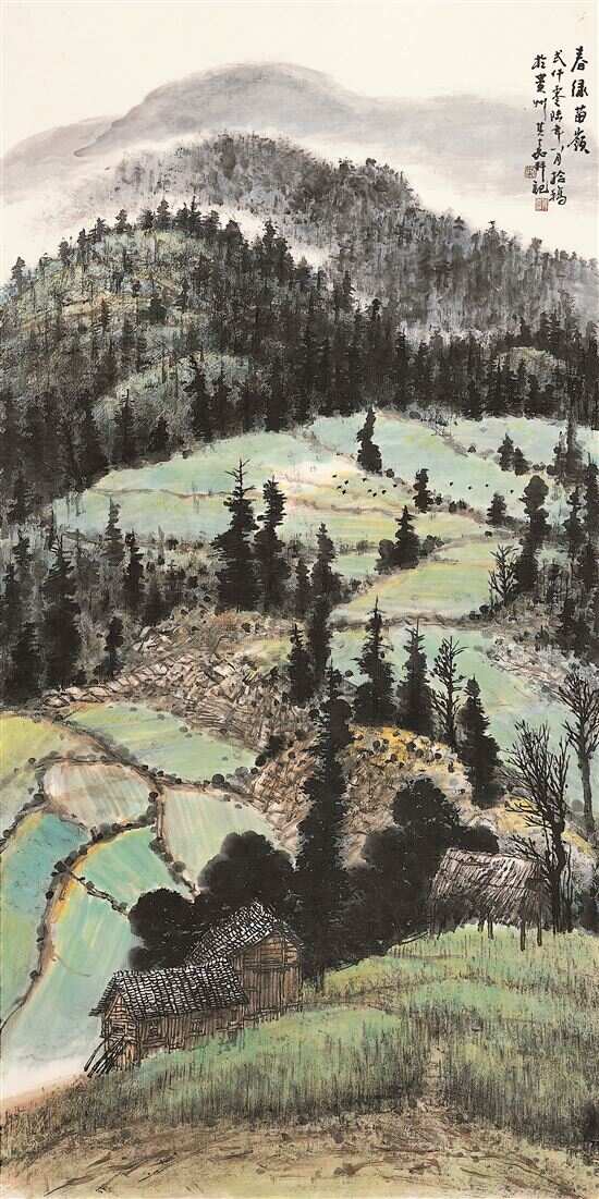 我留意到他非常有特色的一些作品,比如《一江春水》《平沙鱼影》《古劳水乡》《古韵新风》等等,这些应该是各个不同时期探索的留影。即在上世纪八十年代的水乡画的基础上,更大步向前拓宽了视野,思路中既含古人诗意,又有新时代风格。
