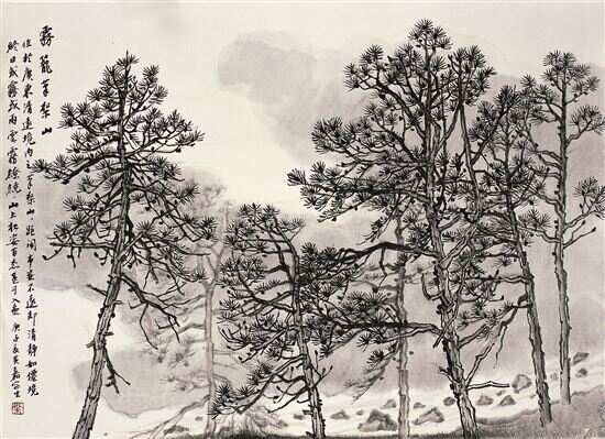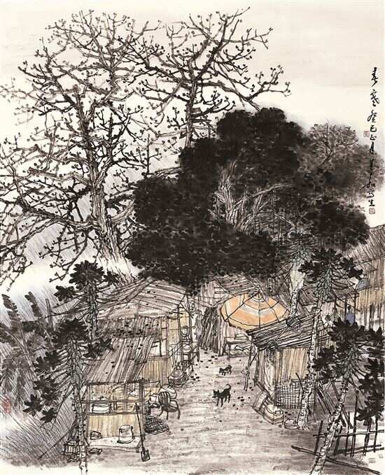 还有一张作品《黄桃古韵》,这应该是一幅特别能代表他艺术面貌的力作。这张写生作品取材于贺州黄桃镇,笔墨意味很有趣,从传统中来又富有自己的面貌。我们从画面中,能看到古榕树、小桥、古亭等等,其嘉用笔沉着,线条厚重,一笔一画积累了他几十年的磨炼,从画中,我们能看到他的努力和勤奋,并且取得丰硕的成果。