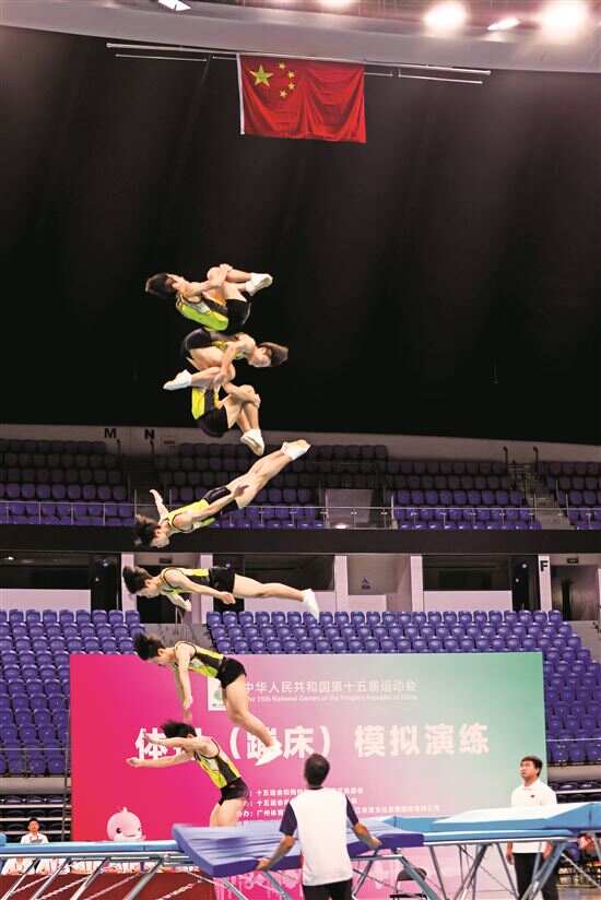 新快报讯 记者高京 通讯员全碧芳报道 十五运会体操(蹦床)模拟演练8月15日在位于白云区的广州体育馆举行。赛事持续至8月17日,上演了精彩的男子、女子组个人和团体比赛。作为十五运会正赛前的一次实战大考,旨在通过实战检验,确保赛事组织和场馆运行有序顺畅。