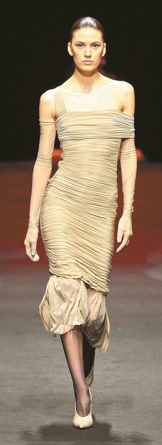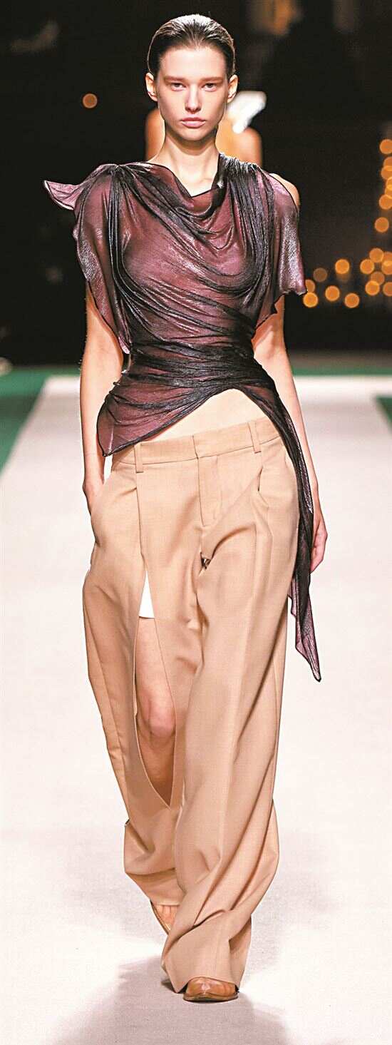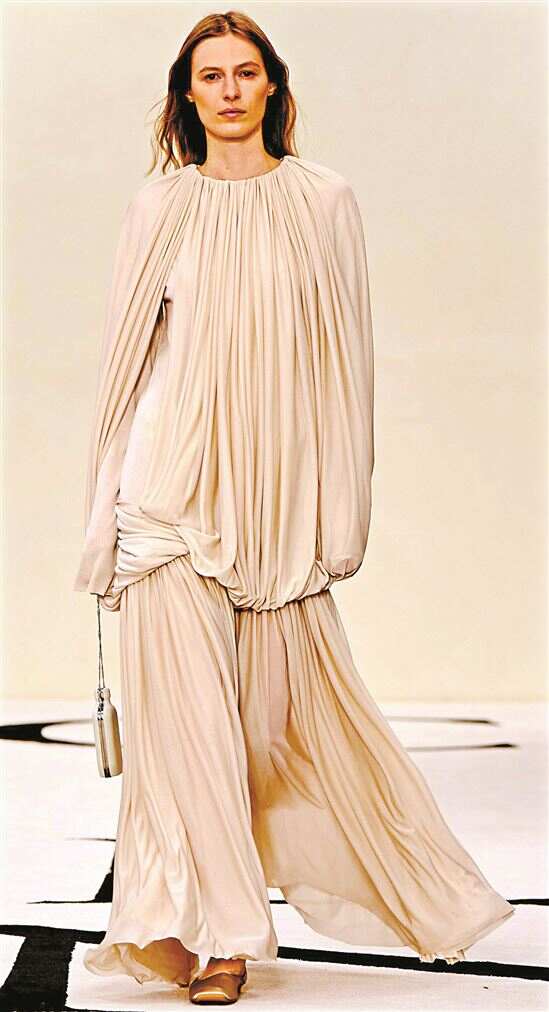 面料质地如“魔法棒”能赋予自然垂褶截然不同的风格与质感,当轻薄如云雾的丝绸邂逅自然垂褶,柔软顺滑的质地使垂褶轻盈飘逸,每一次摆动都仿佛诉说浪漫故事。而厚重羊毛、皮革等面料在自然垂褶的塑造下,则呈现沉稳大气的风格。