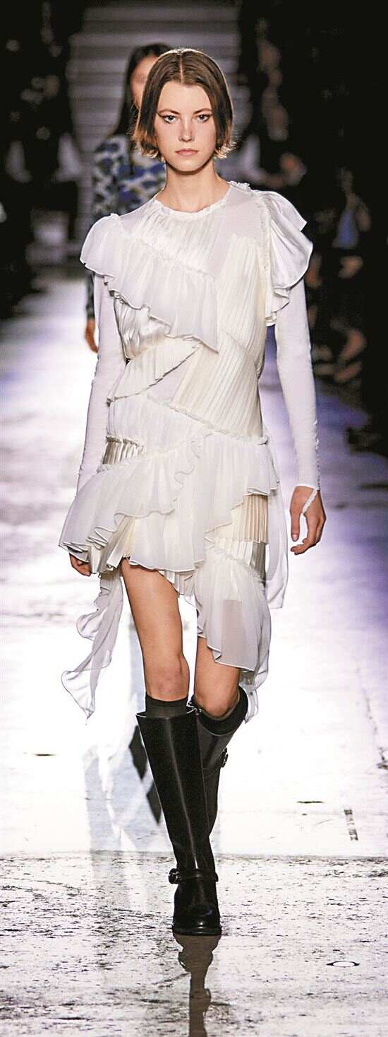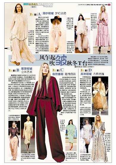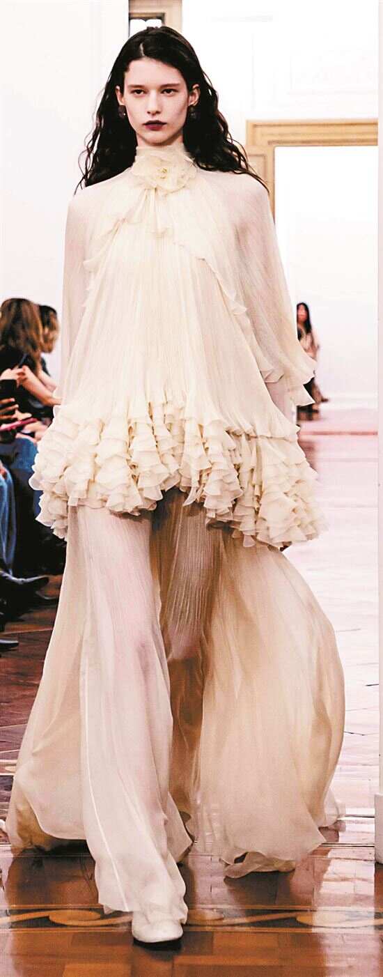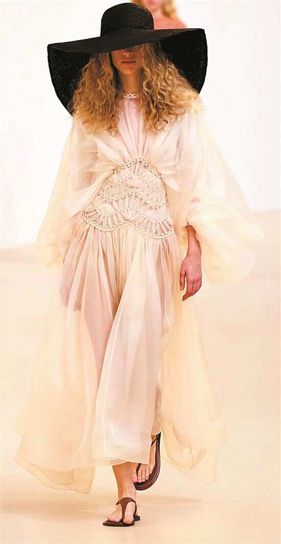 薄纱作为时尚界最受宠的面料之一,毫无悬念地与褶皱相遇了。轻盈透明如清晨薄雾般的薄纱,轻柔笼罩身体,增添朦胧美感;褶皱则如灵动音符跳跃在薄纱上,赋予面料更为丰富的层次感与立体感。