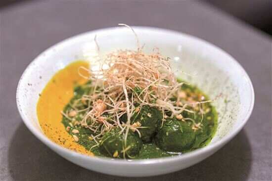 绿咖喱肉丸,菠菜与青椒炒制的绿咖喱口感清香。