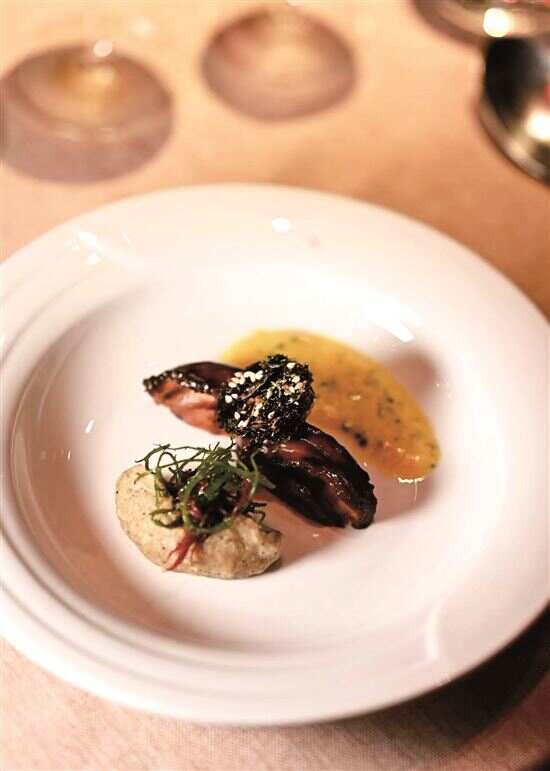 果木炭烤的烹饪方式是恰餐厅特色,一道炭烤鲍鱼令人眼前一亮,吃多了战斧牛排的炭烤,焦香鲜弹的鲍鱼提供了全然不同的口味,一旁辅佐的竟然是茄子泥,亮了。
