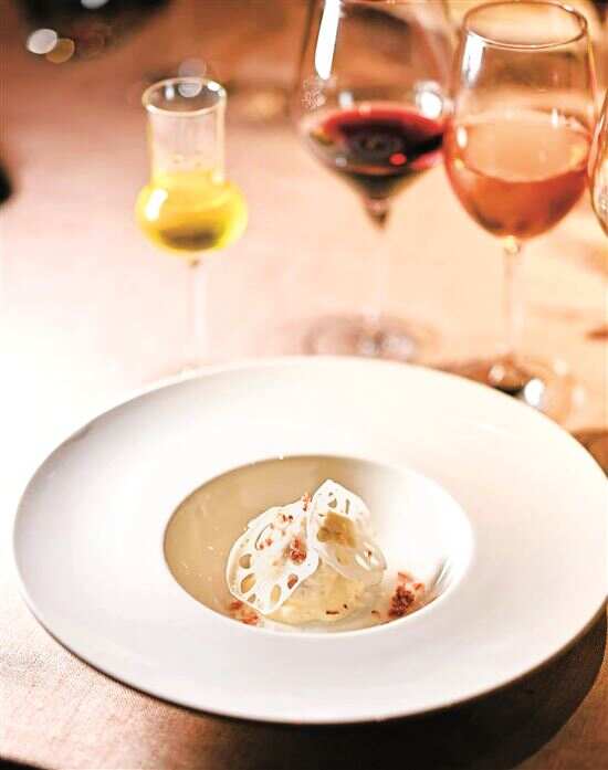 黄鱼这些年也成为一样普遍被采用的食材,用香草油低温慢煮之后的肥美黄鱼卷,配上海鲜高汤打发的轻盈泡沫,细腻油润的鲜便如云朵一般飘进了齿颊间。