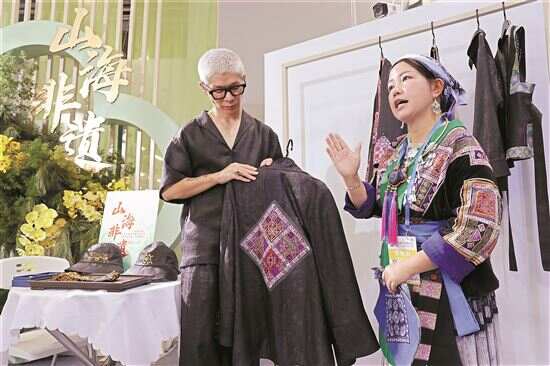 ▲广东的韩冲(左)与贵州的陈洁(右)用香云纱、苗绣共同创作的新作品亮相广博会。