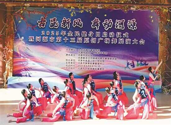 在河源市东源县万绿湖·镜花缘游览区,“古邑新风·舞动河源”2025年全民健身日启动仪式暨河源市第十三届原创广场舞展演大会热力开场。来自河源市各县区的11支代表队以“舞”会友,全面展示河源市原创广场舞创新成果,为市民游客带来了一场融合传统与现代、活力与艺术的视听盛宴。