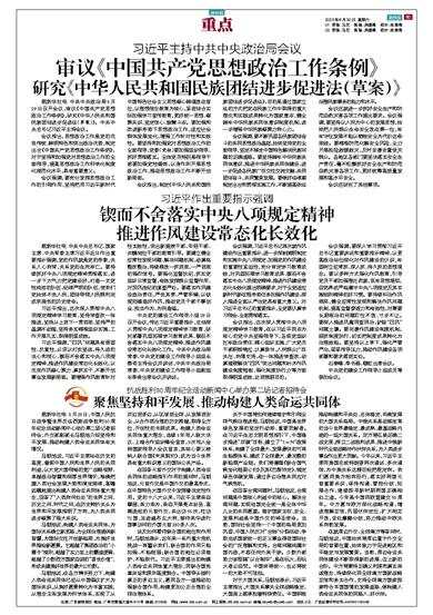 据新华社电 中共中央政治局8月29日召开会议,审议《中国共产党思想政治工作条例》,研究《中华人民共和国民族团结进步促进法(草案)》。中共中央总书记习近平主持会议。