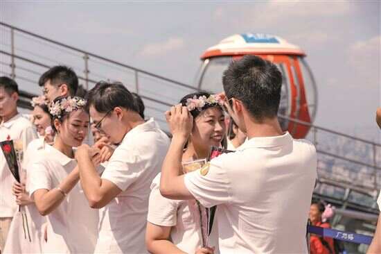 “最好的风景在眼前,最爱的人在身边。”8月29日是“七夕”佳节,在450米的广州塔城市之巅,15对新婚夫妇身着运动风婚服举行集体婚礼,许下一生一世的诺言。