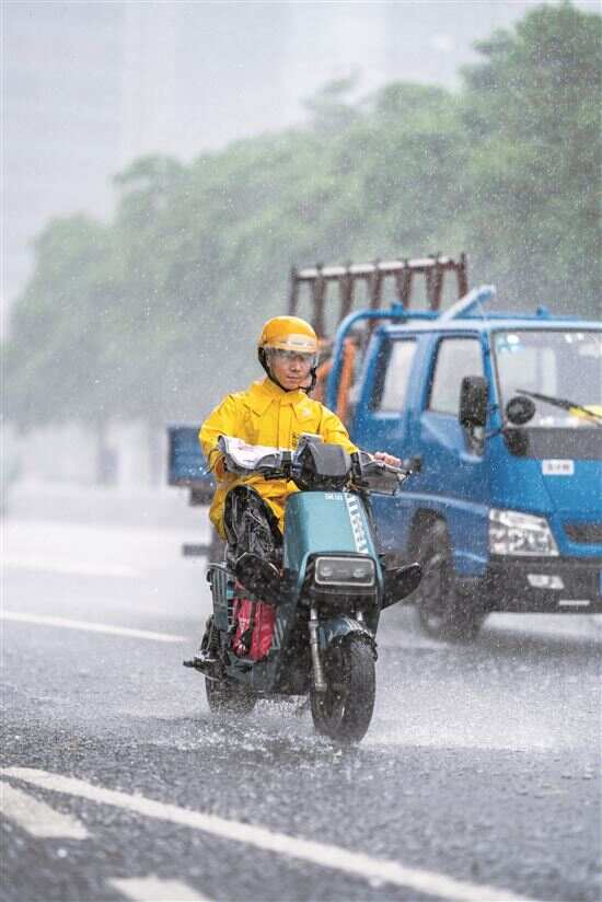 ■在雨中坚持工作的外卖骑手。新快报记者 郭思杰/摄