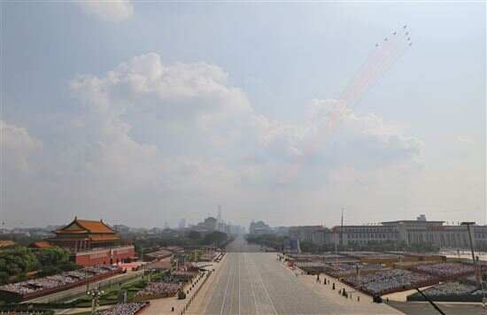 ■9月3日,纪念中国人民抗日战争暨世界反法西斯战争胜利80周年大会在北京隆重举行。这是空中护旗梯队通过天安门广场。