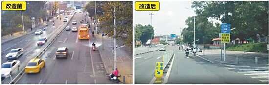 目前已实施试点中,实施前无非机动车道的路段长度占比约14%,如天河区冼村路(双向)、元岗横路(北往南方向)及白云区空港大道(双向)等;实施前非机动车道宽度位于1.5~1.8m之间的路段长度占比约61%,如海珠区新港路、江南大道北(小港路至南华东路)、东晓路(金禧路至前进路)、天河区兴华路(沙太路至广州大道)、沙太南路(兴华路至陶庄路)以及白云区三元里大道(德康路至益寿路)等。实施后,非机动车通行空间均由不足2.5米或“无路可走”拓宽至3.25米以上,骑行体验感得到较大提升。同时,非机动车被隔离护栏限制在机非共享车道内行驶,随意变道穿插大量减少,降低了对其他车道车辆通行干扰,有效改善路段交通秩序。