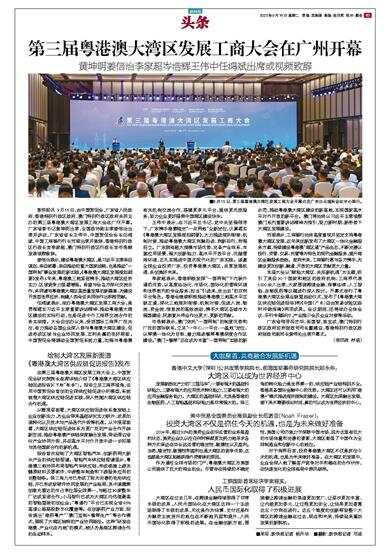 新快报讯 9月15日,由中国贸促会、广东省人民政府、香港特别行政区政府、澳门特别行政区政府共同主办的第三届粤港澳大湾区发展工商大会在广州开幕。广东省委书记黄坤明出席,全国政协副主席姜信治出席并讲话,广东省省长王伟中、中国贸促会会长任鸿斌、中国工商银行行长刘珺出席并致辞,香港特别行政区行政长官李家超、澳门特别行政区行政长官岑浩辉发表视频致辞。