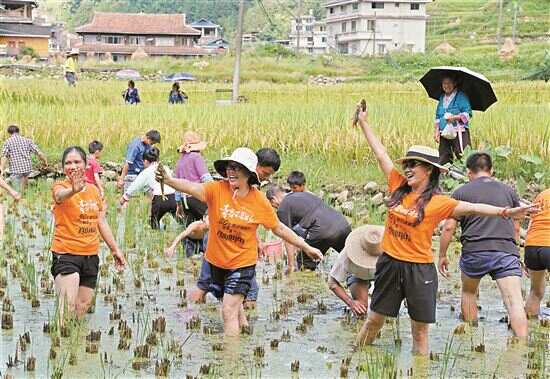 ■9月13日,在广西融水苗族自治县安太乡培秀苗寨,村民和游客在田间摸禾花鱼。新华社发