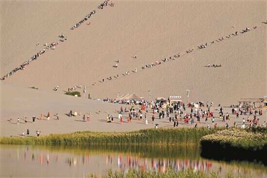 ■9月13日,游客在甘肃省敦煌市鸣沙山月牙泉景区游览。新华社发