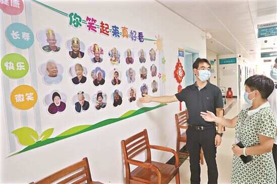 迳头镇中心卫生院是一栋多层建筑,使用面积6000多平方米。新快报记者发现,这里的一到三层是医院的业务科室,四五层则是失能或者半失能老人的养老场所(医养结合科),老人们两至三人一个房间,都有独立床位。走廊上,两位老人正在悠闲地聊天,墙上挂满了各位寿星开心的照片,“健康、长寿、快乐、微笑”,八个字成了他们的真实写照。