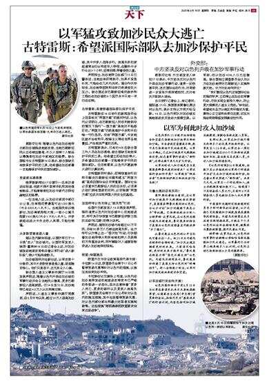 古特雷斯表示,已有约400名联合国工作人员在加沙遇难,联合国缺乏有效保护平民的工具。他希望立即在加沙停火,并希望在加沙部署一支能够保护平民的国际部队。但目前看来,以色列不愿就停火进行认真谈判。