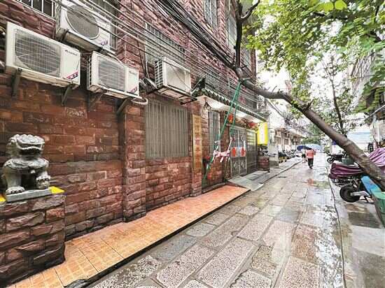吃过肠粉,也别急着往外走,巷子深处也可随意游逛。洞神坊32号是一栋民国时期的历史建筑,名为“纶园”,红色砖混结构带庭院,现在还有人住,旁边有个楼梯可上二楼观望庭院,当然如果你比较“E”的话也可以问问人家能不能进去看看……