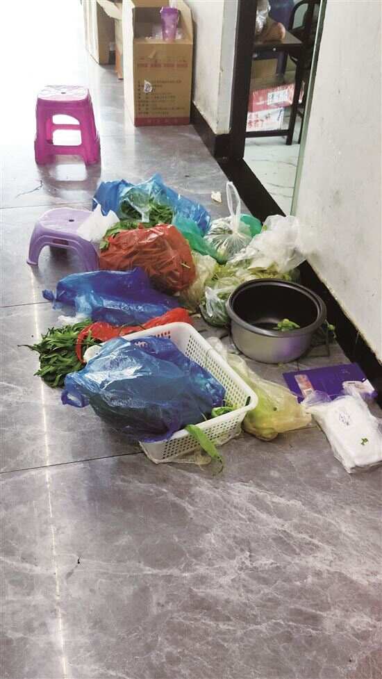 在番禺区黄编大道168号外卖城一家木桶饭外卖店门口,记者看到商户人员正坐在公共走廊的一侧,在没有戴手套的情况下,一边在砧板上切青椒,一边将切细后的青椒移至直接与地面接触的菜筐中。在该外卖城,一家杂咸粥铺店家将一袋袋用塑料袋装着的蔬菜随意堆放在门前,一些塑料袋口还没有绑好,蔬菜裸露放置,甚至直接与公共走廊的地面接触。