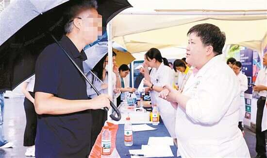 ■路过市民冒雨到摊位了解阿尔茨海默病防治知识。
