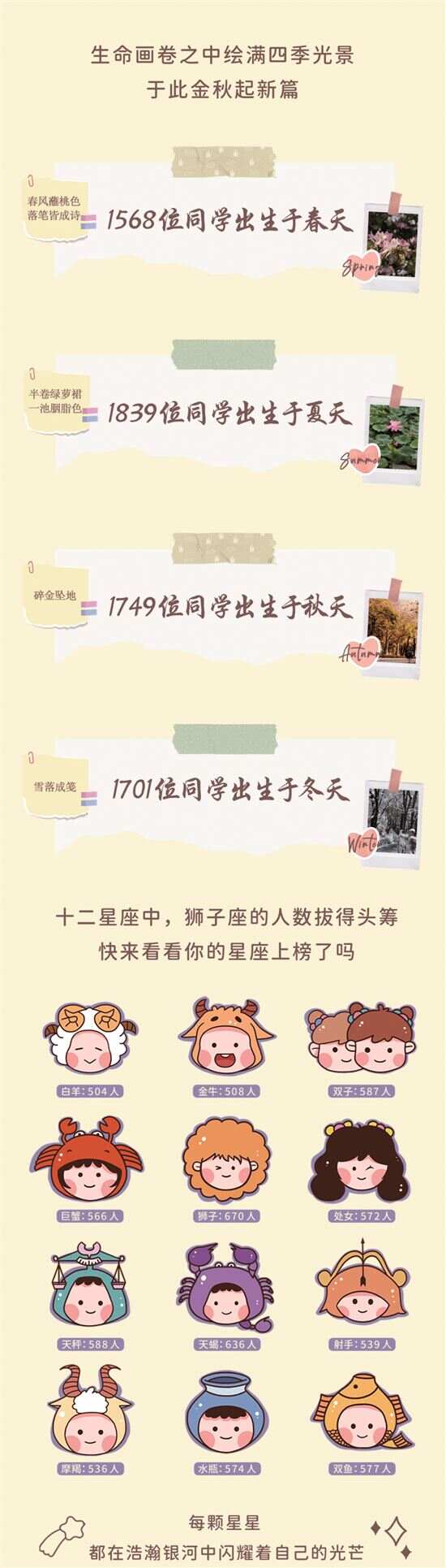 出生年月方面,2025级本科新生在十二生肖中人数最多的是2007年的“猪宝宝”,有高校在数据报告中送上了“‘猪’事皆宜”的祝愿;星座上,今年狮子座稳居C位,广东财经大学和华南理工大学的新生中,狮子座人数占比最高。此外,处女座、巨蟹座、天蝎座的同学占比也不少,相对而言,星座的分布在高校新生中较为平均。