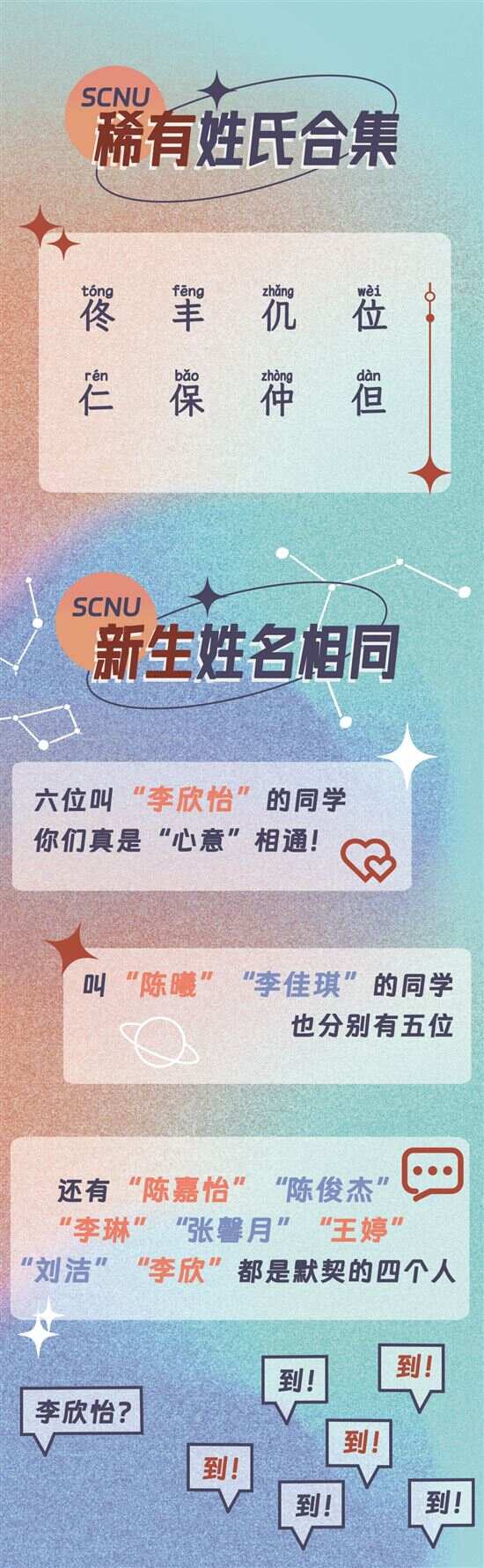 值得一提的是,今年新生中也出现了一些稀有姓氏,比如鄢、缑、濮、丰、仉、位等,十分考验大家的认读能力。深圳大学、华南师范大学都贴心地给稀有姓氏标出了正确读音,方便新生见面时“自信say hi”。而华南农业大学的萌新中,还有两位姓“农”的同学,看来“名中注定”与华农有着特别的缘分。