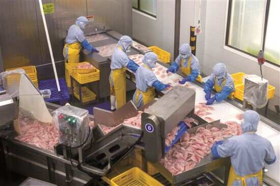 在双洋公司的加工车间,罗非鱼被加工成鱼排,经过冷冻包装后,运往海内外市场。双洋公司去年7月在茂南落地运营,目前三条生产线已满负荷运转,每天收购、加工罗非鱼约14万斤,带动350人稳定就业。
