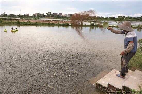 ■在京塘农业养殖基地,饲养员给罗非鱼喂食。