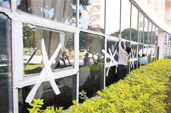 9月23日,在阳江海陵岛一家酒店,工作人员在给玻璃门贴上胶带。新华社发