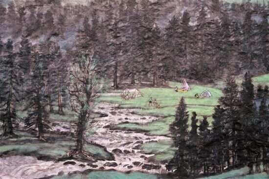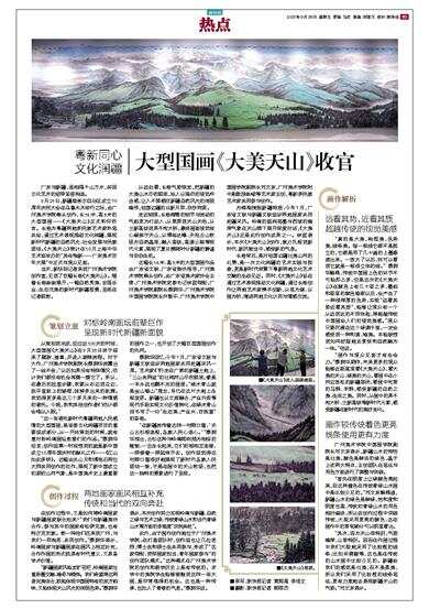 “其次,因为天山很特别,气势雄浑、山势特别。因而在作画过程中我们大胆地采用了比较粗的线条,比如斧劈皴等,这也是在传统的山水画中比较少见的。新疆给我们的感觉是壮美,而不是柔美,所以我们采用了比较粗的线条笔法,更有力度地去表现新疆天山的气势。”刘文东表示。