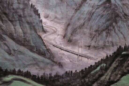 走近细观,长卷精微的细节与流动的气韵更为打动人:从草原到天山天池,从兰新高铁到果子沟大桥,最终画面视觉核心凝练于天山,以博格达峰、天池云山牧场为自然基底,融入高铁,高速公路等现代元素,展现了夏日拂晓时分新疆的静谧与勃勃生机。