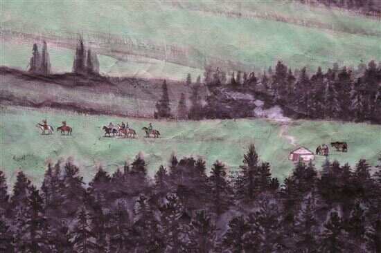 “首先在明度上让绿颜色亮起来,而这种着色在传统青绿山水画中是比较少见的。”刘文东解释道,新疆山水的绿色是鲜绿,饱和度和明度也高,传统的青绿山水的用色相对偏淡,所以在创作过程中突破传统,大胆采用更亮的颜色,这在画作中的草甸部分可以明显看出。