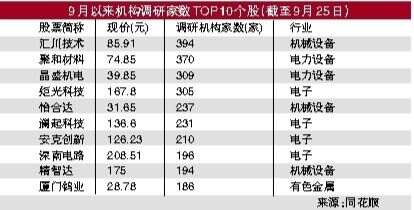 随着9月震荡行情的展开,择股“高低切换”的建议被不少分析人士频繁提出。除基本面及价格区间上涨幅度外,机构调研信息也是对上市公司信息的重要补充。9月以来,有1922家上市公司接待了来自保险、券商和基金公司以及海外机构的调研,其中包括236家机械设备行业公司,近200家电子行业个股,基础化工、医药生物、计算机和汽车行业的公司均超百家。