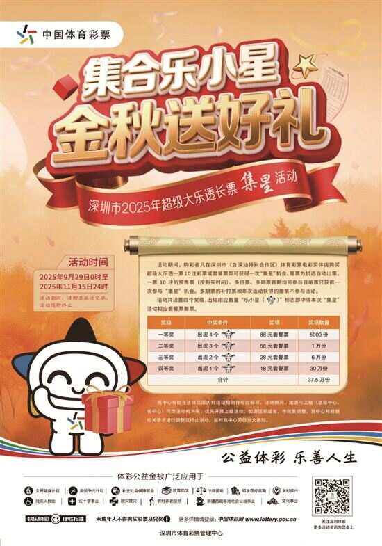 本次活动从2025年9月29日00:00:00至2025年11月15日23:59:59,其间在深圳市(含深汕特别合作区)体育彩票电彩实体店,购买超级大乐透一票10注彩票(一张单期票面打印10注单式号码的彩票,含追加)或套餐票,即可获得1次“集星”机会。