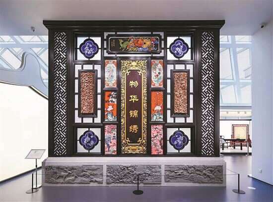 “物华锦绣”展厅所展是关于广东的生产生活美学,例如:色彩鲜艳、精细繁复的织绣,釉色润泽、造型典雅的陶瓷烧制,刻工巧夺、精致华丽的广东木作,以及常用于节庆装饰的木版年画与剪纸等。这里还把广东人的屋檐“搬”进展馆,方便人们近距离欣赏屋顶嵌瓷的惟妙惟肖。